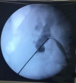 Kidney stone visualized by fluoroscopy